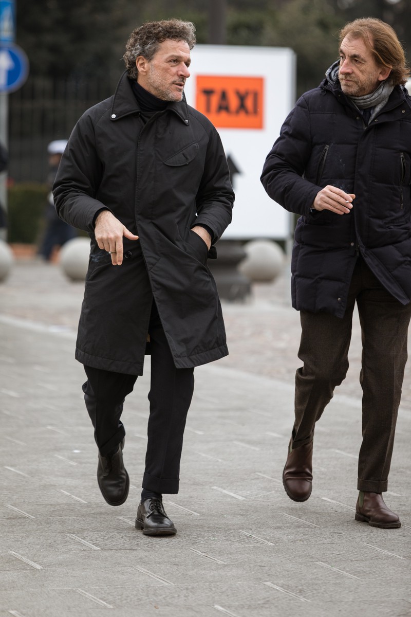 向かって左の御仁、軽やかにシャカシャカコートを着こなしております。黒のタートルネックニットをインナーに、ウールの黒スラックスを少し短めに丈上げし、黒のプレントゥで引き締めています。ナイロン、ウール、レザーという素材のコントラストが、黒一色の着こなしに奥行きを感じさせます。