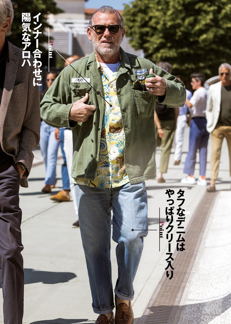 ヴィンテージとおぼしき本格ミリタリージャケットのインナーにイエローのアロハシャツ。このどこかお茶目なミスマッチこそ、この夏のイタリアオヤジの気分です。