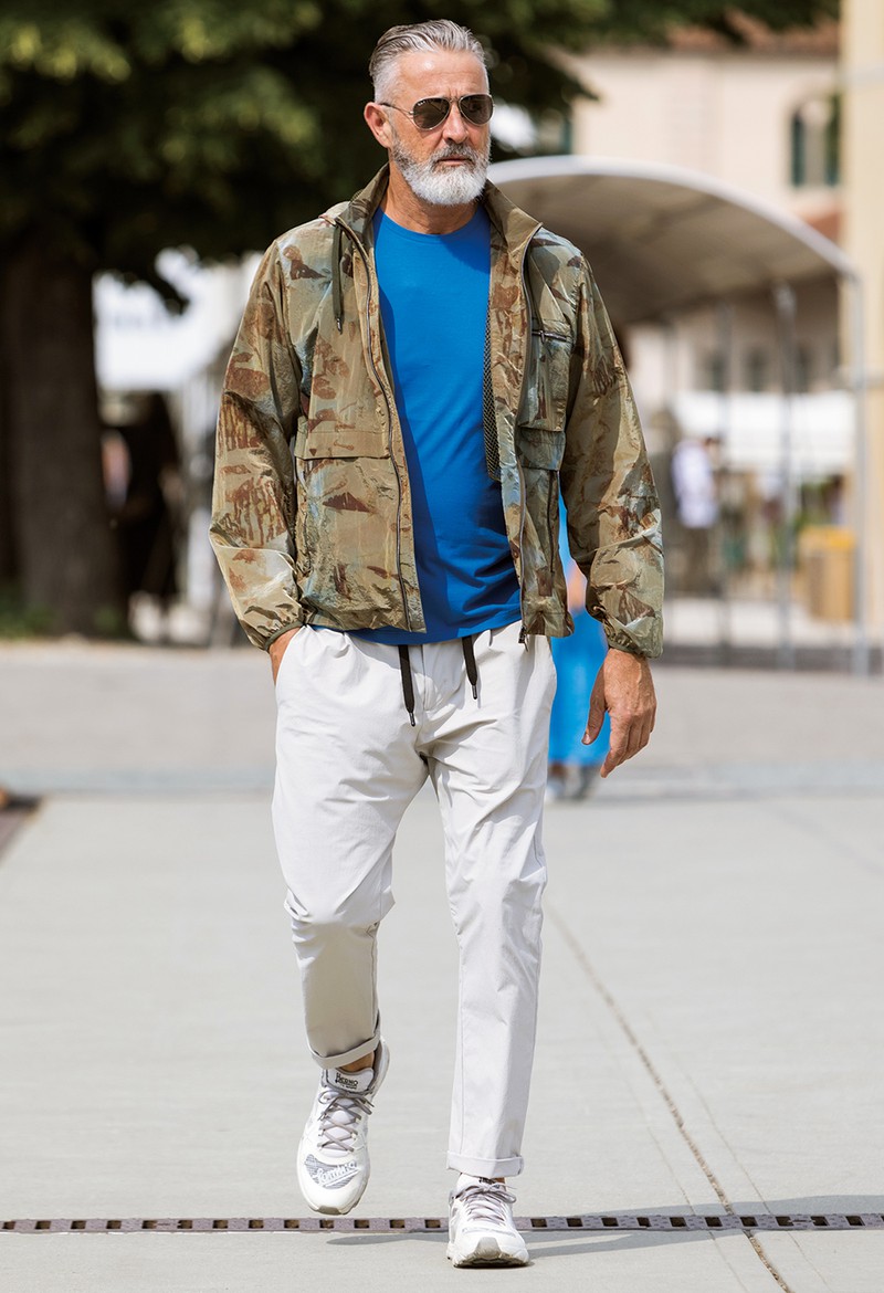 こちらのオヤジさんはカモフラ柄のミリタリージャケットに鮮やかなロイヤルブルーのTシャツ。こういう合わせも以前は見られなかった明るくポップなテイストです。