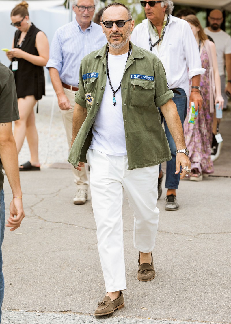イタリアオヤジはミリタリーも大好物。で、これまではドレスのハズしに利用する、というのが定石でした。ところが、今季は懐かしいくらいにアメリカン。選びも皆さん本格派ですが、コーデがどっかハッピーなのです。このお茶目なセンス、新鮮かつ絶妙ですよね。