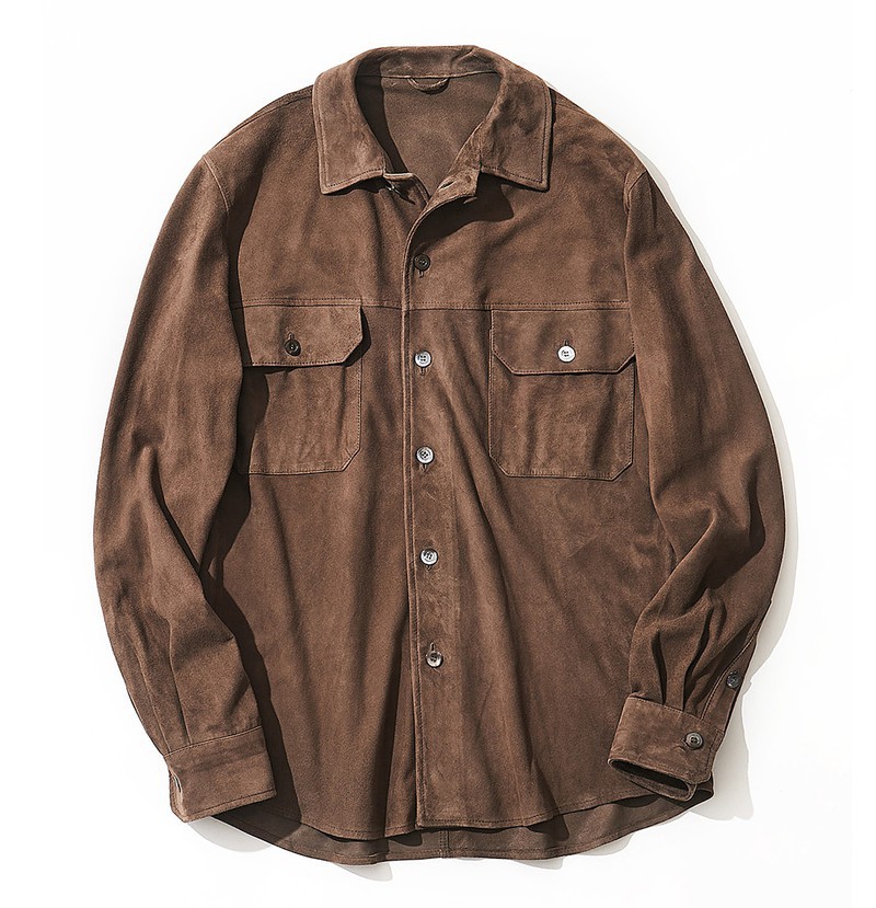 フィレンツェ郊外を拠点とするレザーウエアブランド、チンクワンタ。今回ご紹介するモデルは、英国軍のアーミーシャツをオープンカラーに仕立てたビームスの別注モデル。こちらはチンクワンタの定番素材としても人気のゴートスエードを採用。ちなみにゴートスエードとは、山羊革の表面をサンドペーパーなどで削り、ビロードのような滑らかな感触に仕上げたもの。レザーの中でもすこぶる柔らかな素材です。また、裏地を省いた一枚仕立てゆえ、春夏シーズンでも軽快に着こなせるのがポイント。レザーだけでなく、ボタンも上質な貝ボタン使用するなど、細部から高級感が伝わります。