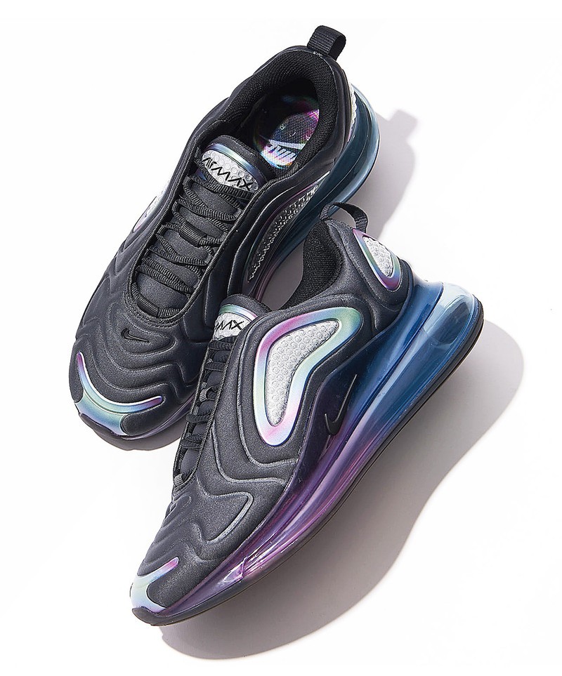 虹色グラデーションが美しいエアマックス720 20の新色モデル。ポッドから放射状に広がるアッパーの成型ラインが、波を思わせる形状でフューチャリスティックな印象を醸しています。シリーズのアイコンになっているのは、アウトソールに搭載したエアユニット。ナイキ史上最大の容量を誇り、ヒールアップはなんと驚異の38mm。抜群のクッショニングをもたらしてくれるとあって、背高効果も抜群です。
