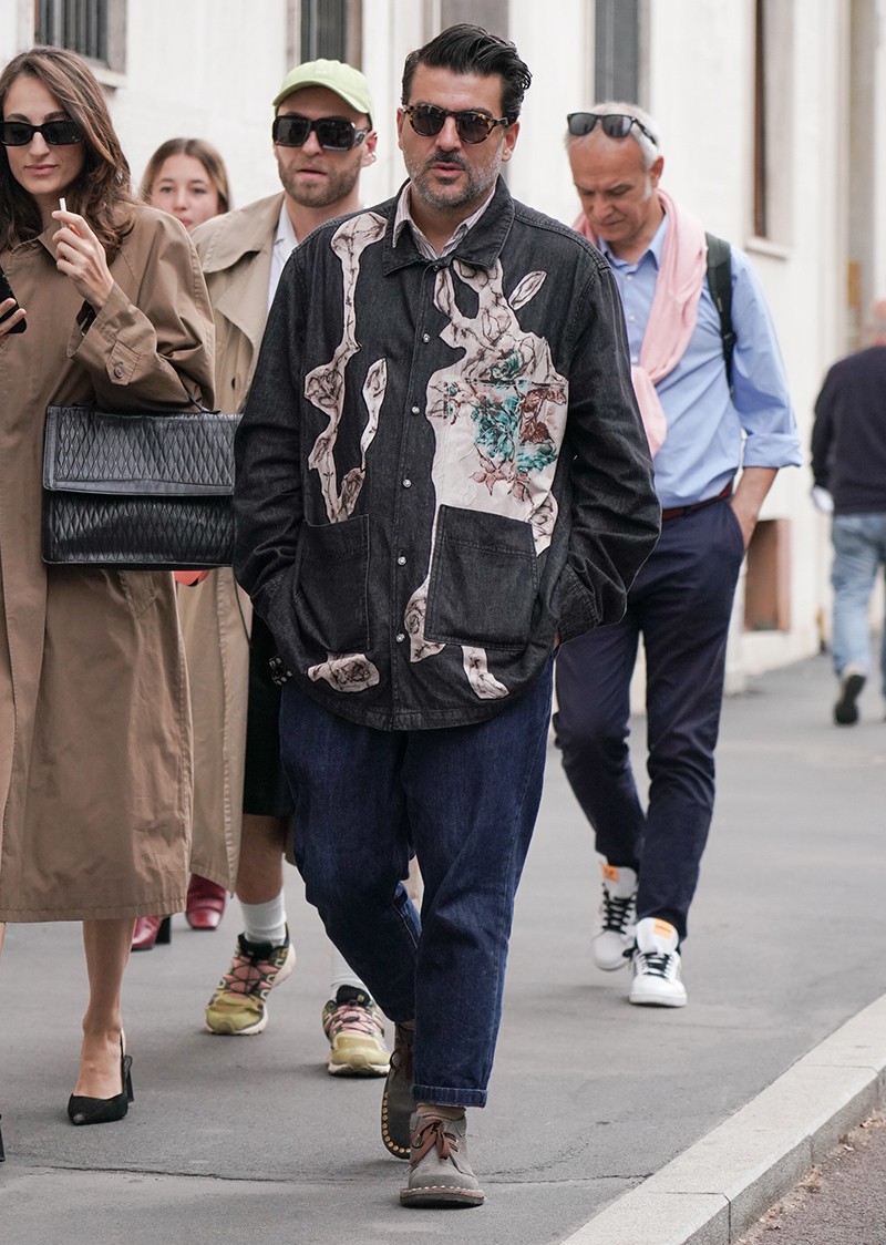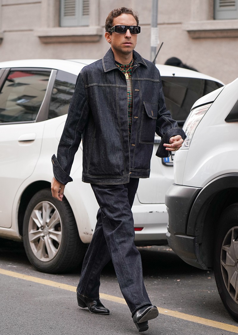 如何せん野暮ったくなりがちなデニムonデニム。いっそこんなアーティスティックな1着なら、それも回避できそうです。加えて、強めなテーパードを効かせているのも、功を奏してます。