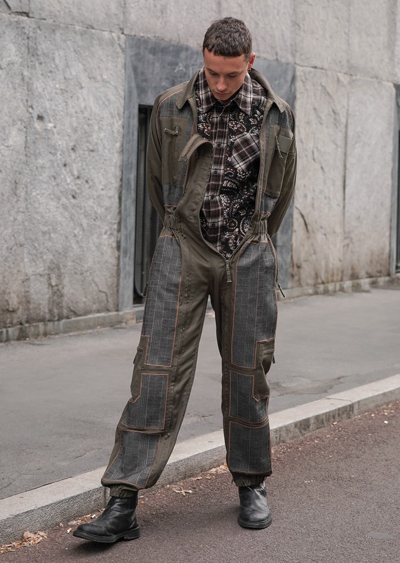 どうしたってミリタリーになるジャンプスーツが、グレンチェックのパッチワークで英国クラシックに。さらに、シャツもチェック×ペイズリー。ココまで振り切った方が、勝ちってコトです。