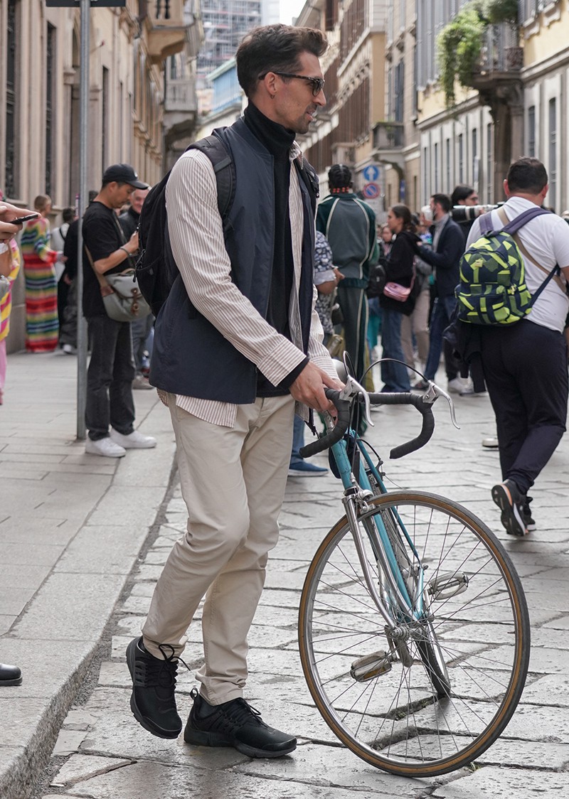 実にさわやか、実に好印象。スポーティなベスト&スニーカーも、ストライプのシャツやタートルネックニット、そしてライトベージュで揃えることで、全体としては品良く見せています。