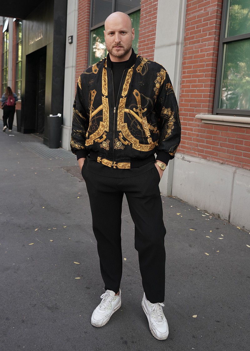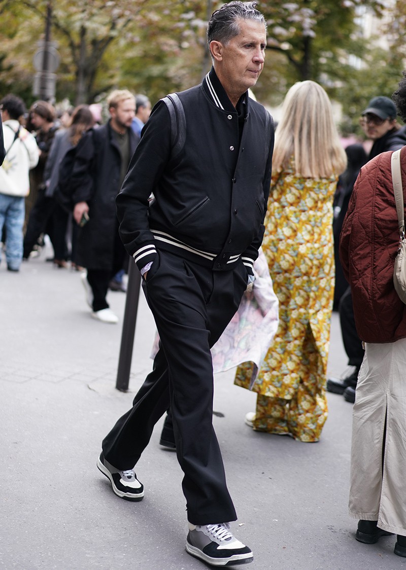 80年代のシルクブルゾンが古着市場で人気ですが、コチラはまさにそんなトコロ。アクの強い1着ですが、コチラの御仁のようにモノトーンで他をまとめるのが上手く着こなすコツ。