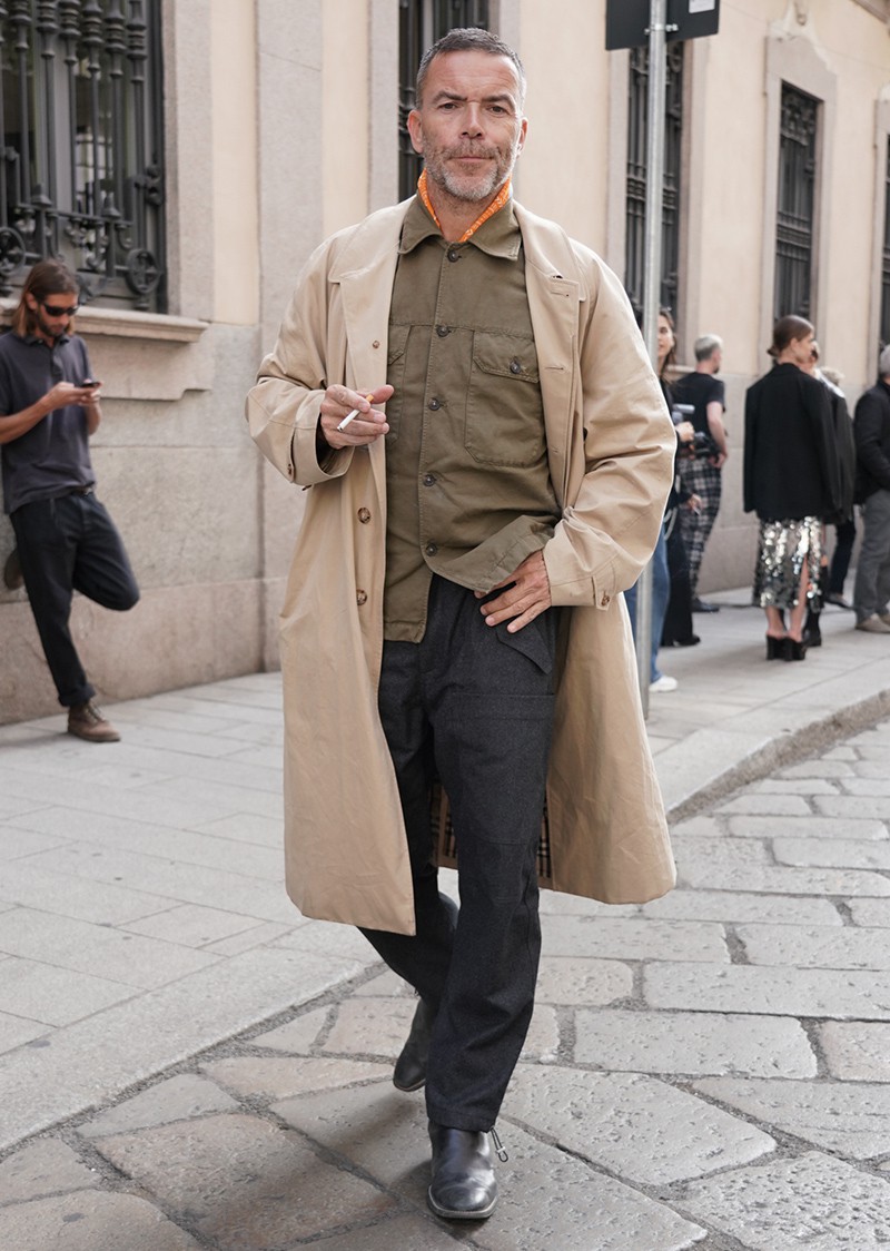 ベージュのダスターコートに合わせたのは、カーキグリーンのフィールドシャツ。さらにパンツもフラップ付きポケットのミリタリー仕様ですが、全体としては実に品良し。首元に配したアクセントカラーの遊びも注目。