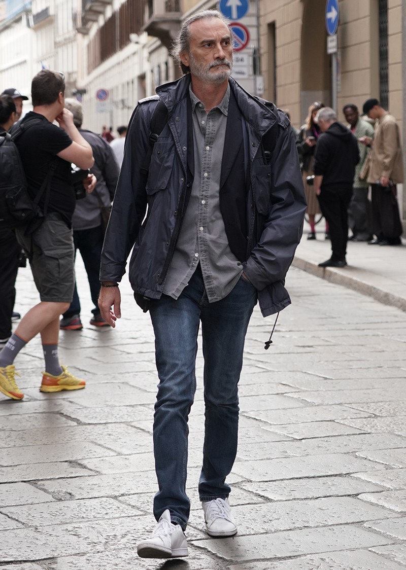 ミリタリーなフィールドジャケットも、ネイビーなら都会的に。それでも、色落ちしたグレーデニムのシャツにインディゴブルーデニムのパンツとで、あくまでワイルドに。一方、足元は白スニーカーで品良く。