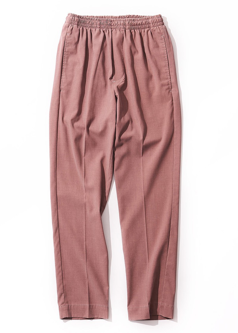 まさしくスモーキーピンクと呼べる理想的な色合い。正確にはスモーキーローズといったところでしょうか。クリース入りですが、ウエストはギャザー×ドローコードのイージーパンツ仕立てに。さらに生地にはポリエステルにレーヨンとポリウレタンをブレンドした生地なので、サラリとした快適な穿き心地を楽しめます。