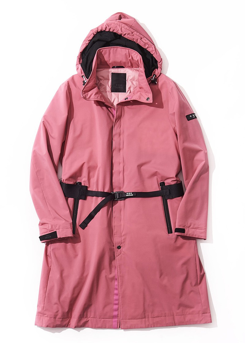 春らしさをより楽しむなら、スモーキーにしてやや濃いめのこんな1着を。フードをジップで着脱することができるこちらのコートは、タトラスが開発した防水透湿性、軽量性に優れたナイロンを採用。極薄くダウンを入れることで、寒の戻りにちょうど良い保温性も備えています。ミリタリーを想起させるベルテッドデザインも、ピンクを男っぽく見せてくれる理由です。