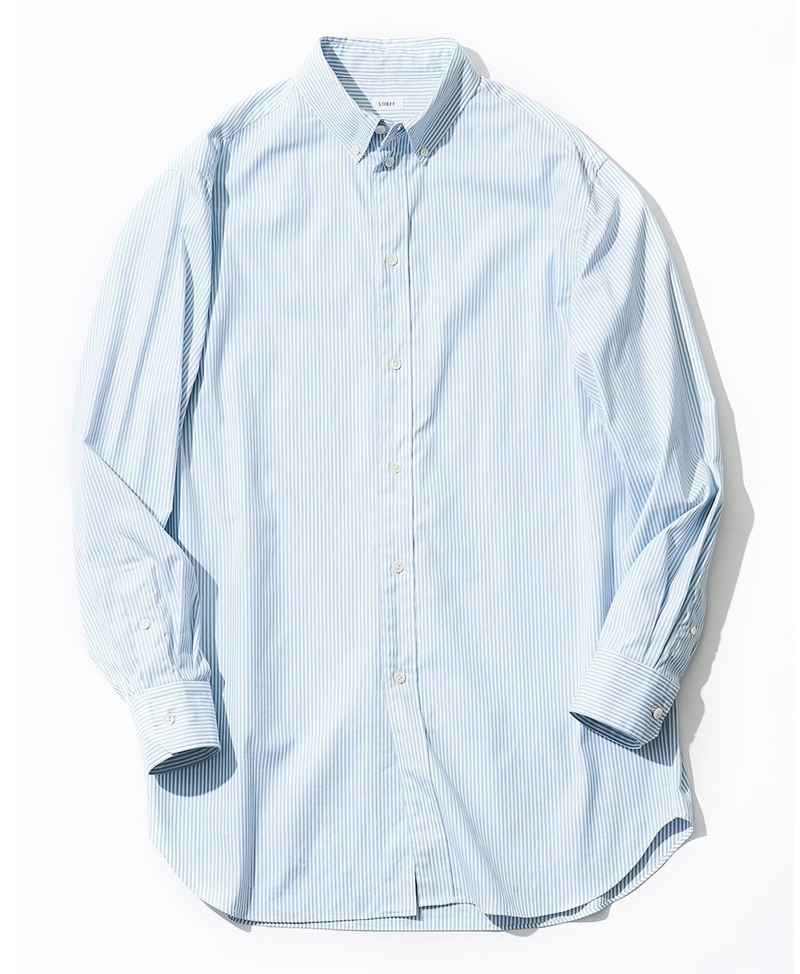 襟付きのシャツはアイロンをかけなくても、どんな方が着ても、それなりにきちんと見えますよね。中でもブルー系の生地は、白と並んで清潔感が感じられるカラー。その上、ストライプが入っていると視覚的にシャープに見え、グッと真面目さが強調されるので、カジュアルにもってこいの色柄なんです。