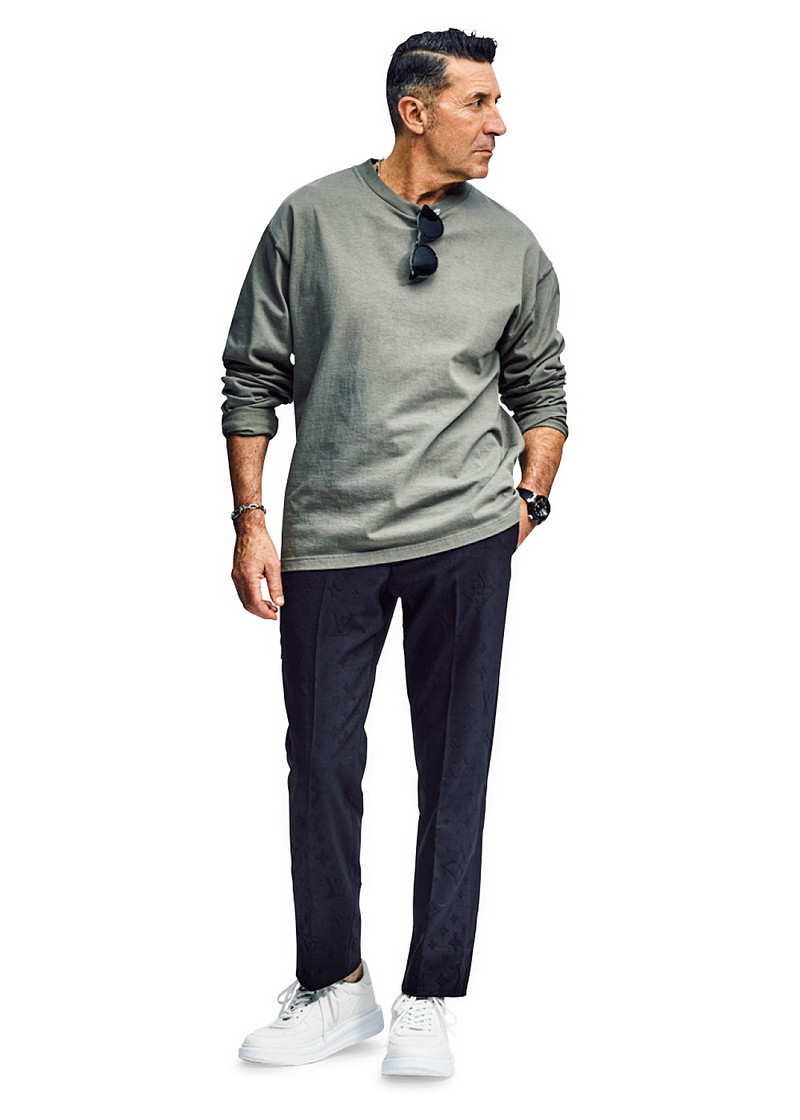 イエローとブラックの、あまりに 見覚えのあるデザインを反転してオン。 鏡に映すといつもの顔に見えますよ。 小ぶりでシックなサイズも わかってるな〜。カットソー 7万5000円、ネックレス7万8000円 /ともにルイ・ヴィトン(ルイ・ ヴィトン クライアントサービス)