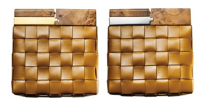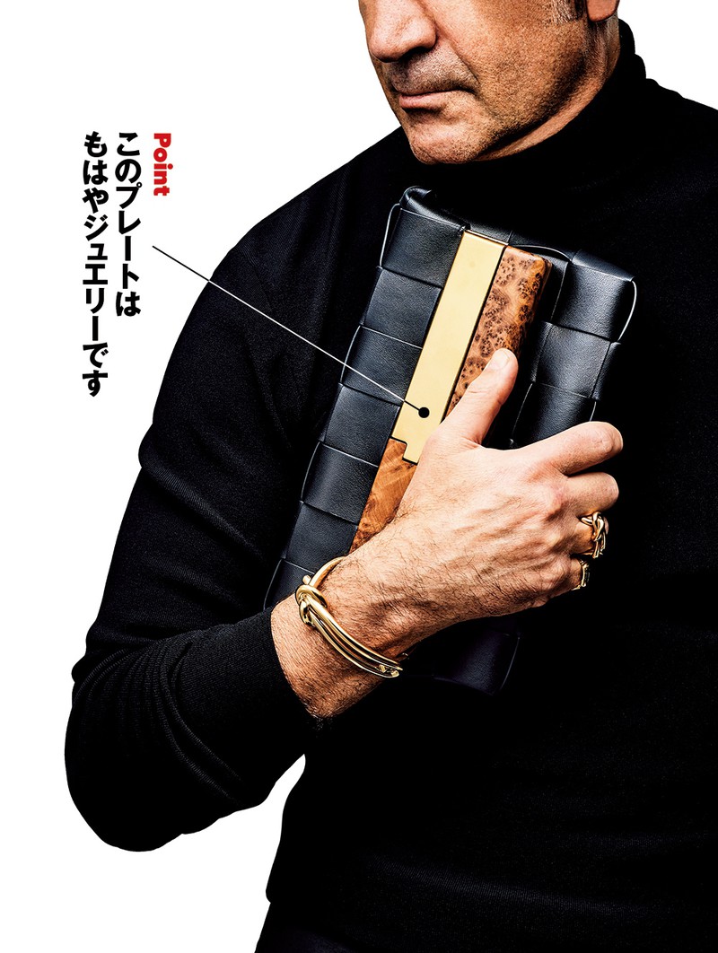 自己満足の世界ともいわれそうな金属の色合わせですが、このクラッチの大きなプレートなら、そのこだわりを語ることなく語らせることができます。洋服をフル黒にすればより一層こだわりの“合わせ”がわかりやすい&ぎらりな感じに映えますよ。 バッグ[W28×H26×D5㎝]37万円、ニット12万5000円、 パンツ8万円、リング(薬指)5万9000円、(小指)4万8000円、 ブレスレット11万3000円/すべてボッテガ・ヴェネタ (ボッテガ・ヴェネタ ジャパン)