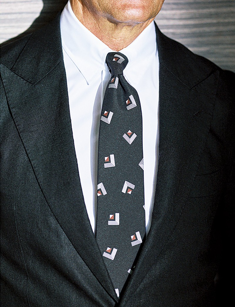 艶黒リネンスーツのもつ都会的でモダンなムードを生かすには、モノトーンのコーディネートが有効。 真っ白なタブカラーシャツに、幾何学柄を配した黒ベースの小紋タイを合わせ、ノットを小さくキリッと締める。すると、スーツの黒が際立つモードなキメのスタイルとなるのです。