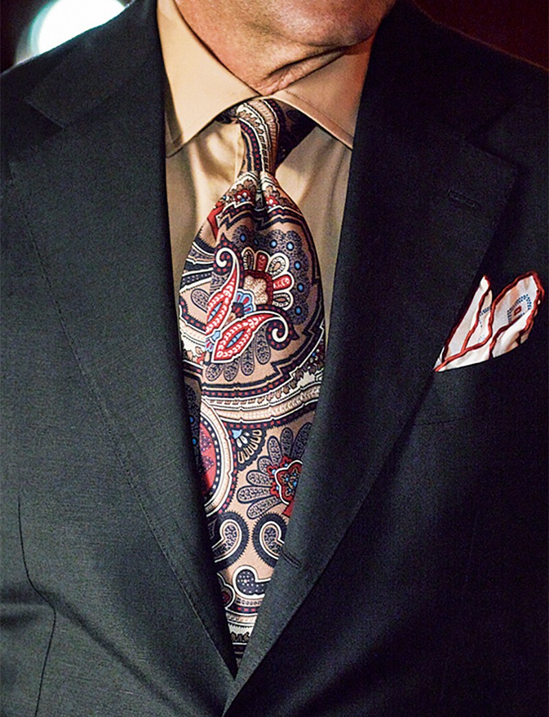クラシカルでこなれ感あるリネン素材の一着ゆえ、 黒スーツでありながらラテンな色気漂う暖色系のVゾーンもしっかりとキマります。明るい色のシャツに、華やかな大柄プリントタイの合わせならその効果もひとしお。モノトーン合わせの時とはまったく違う人物像を演出できますよ。