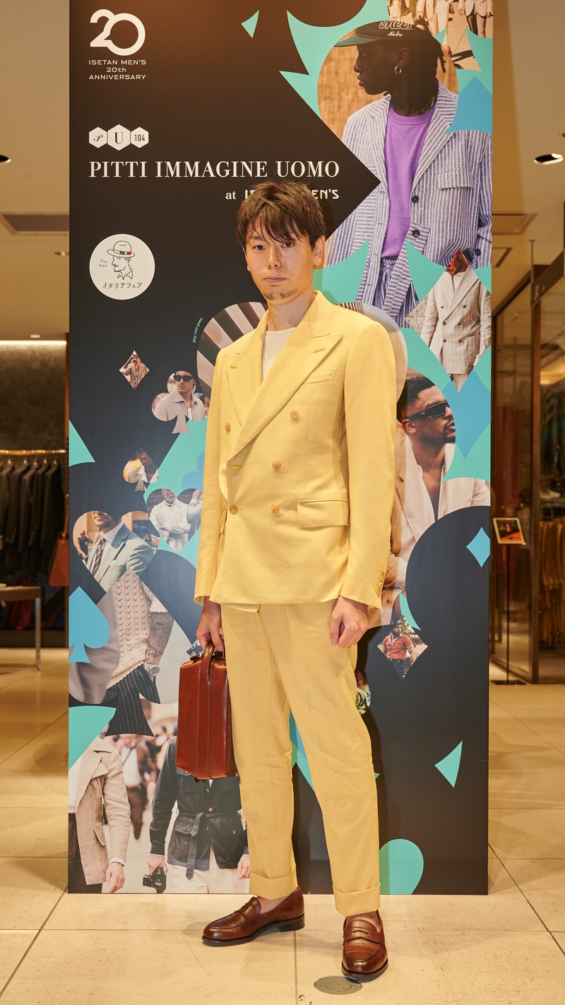 ▲ 清水亮太郎さん(エンジニア)オーダースーツはヒデアキ サトウ。夏の終わりを、さわやかなリネンのイエロースーツで楽しんでいました。