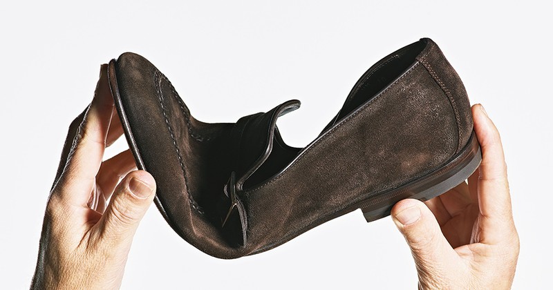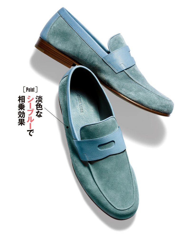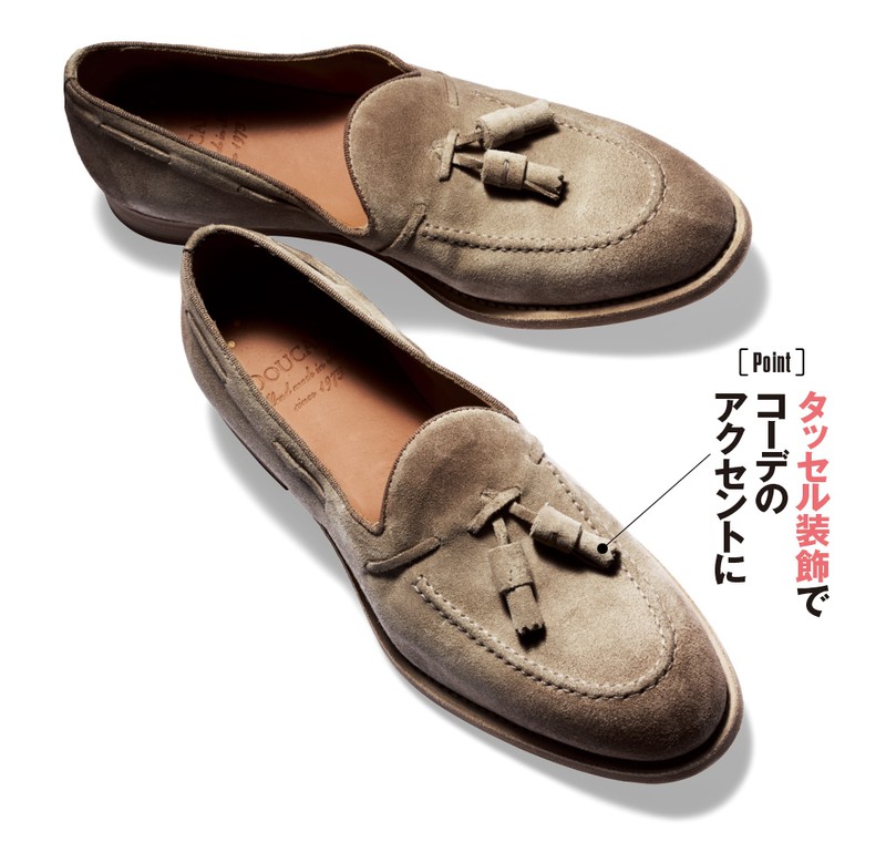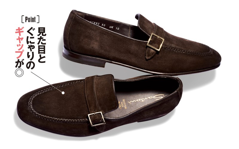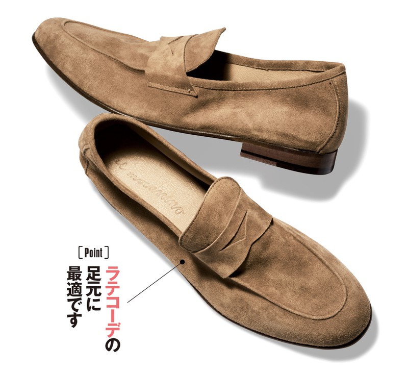 同ブランドのスエードモカシンは手で曲げてみてもわかりやすいほどのぐにゃスエードっぷり。 当然のことながら履き心地も快適ゆえこの春夏のヌキのスーツの着こなしには欠かせません。