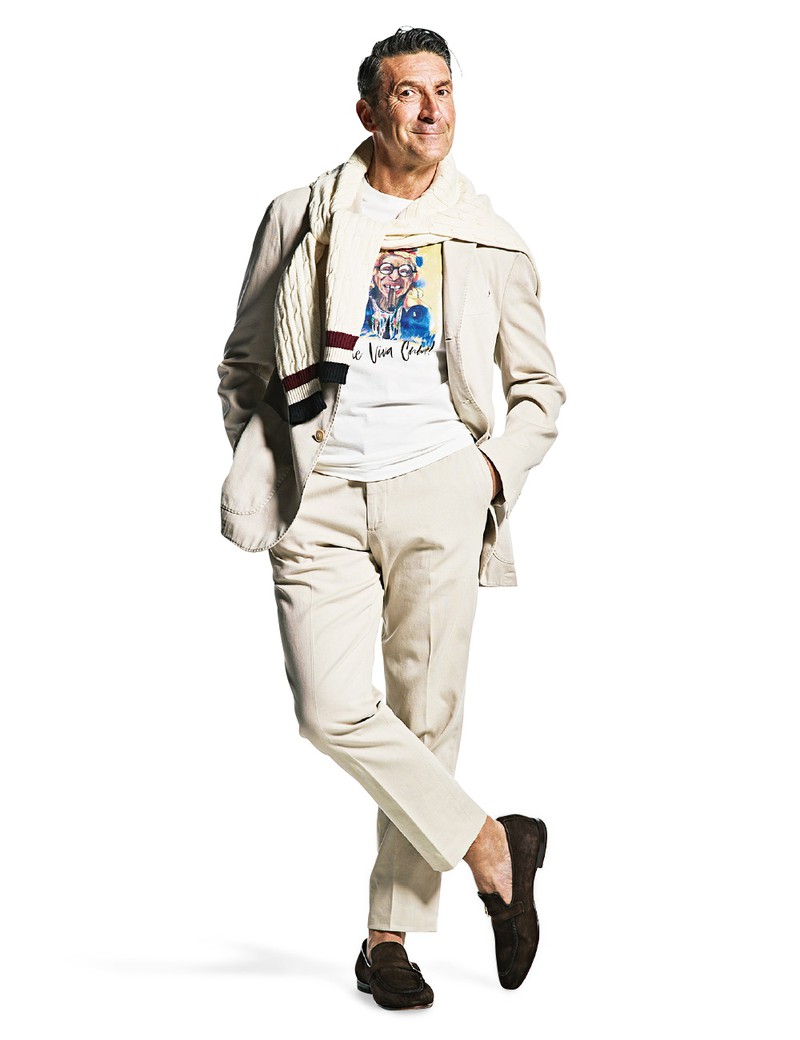 靴13万4000円/サントーニ(リエート)、スーツ13万8000円/ボリオリ(三崎商事)、ニット3万4000円/ドルモア(ナノ・ユニバース カスタマーサービス)、Tシャツ1万7000円/ラルディーニ(ラルディーニ東京店)
