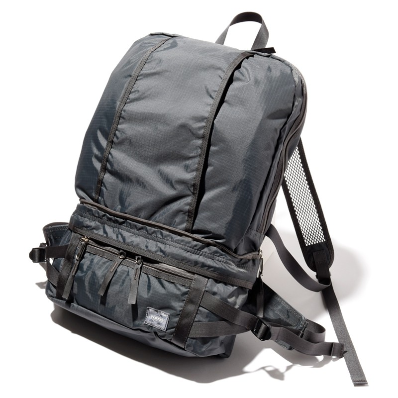そこで皆様にリコメンドしたいポーターのシリーズがふたつございます。ひとつは「ポーター フォーダブル」。サコッシュの背面側にトートバッグやデイパックが収納されており、荷物が増えたときにも対応できる仕様が魅力。そして「トリップ」は、単体でリュックサック⇔ウエストバッグ、リュックサック⇔ショルダバッグと大きく形状が変わるシリーズです。