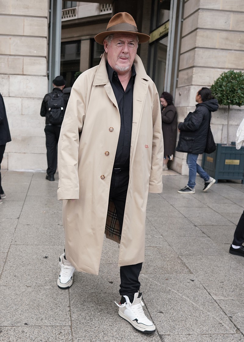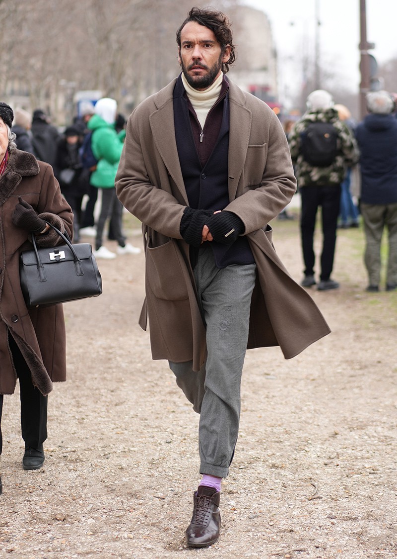 こちらのイケおじさんが着ているアイテムもシンプルなんですが、色のバランスがとてもウマいんですよね。ベージュと好相性なカーキグリーンのパンツを合わせつつ、足元はコートの色とシンクロ。それを色気のある黒タートルで引き締めるって寸法です。