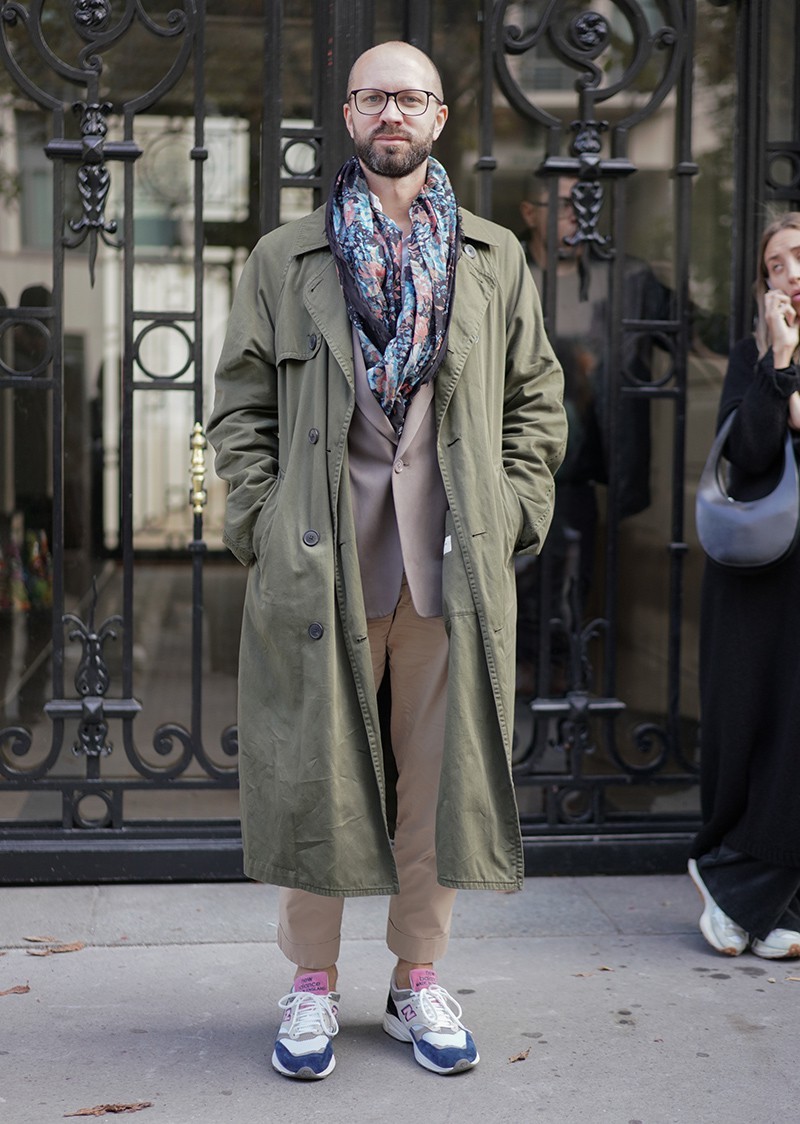 カーキグリーンの無骨感たっぷりのミリタリー風コートも、ゆったりシルエットで抜け感を。さらにベージュトーンのジャケパン&スニーカーとでストリート感を漂わせていますが、花柄のストールで首元にエロさを追加。