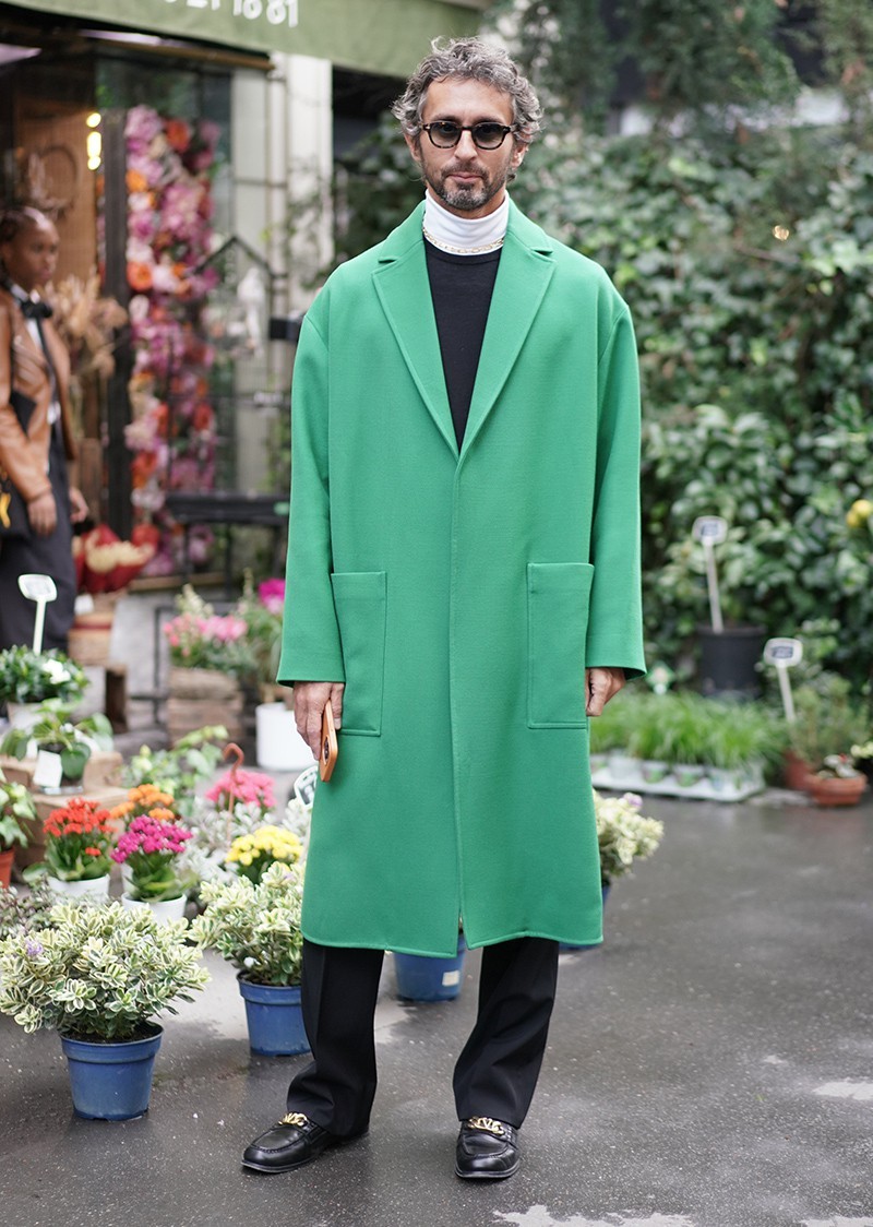 あざやかなグリーンのコートを、リラックスシルエットで着こなしたこちら。ポップになりがちな色とサイズですが、ニットとスラックス、そしてビットローファーもすべてブラックでまとめて色気もしっかり出していますね。ビットローファーのゴールドもエロい!