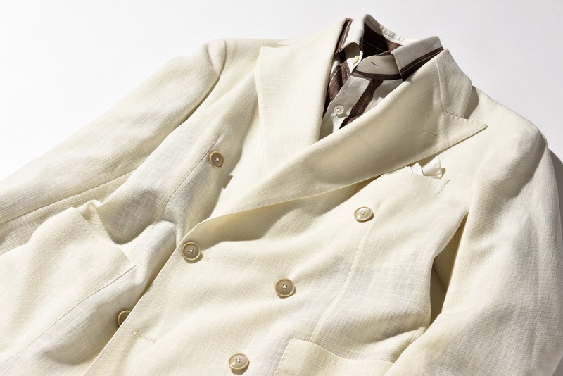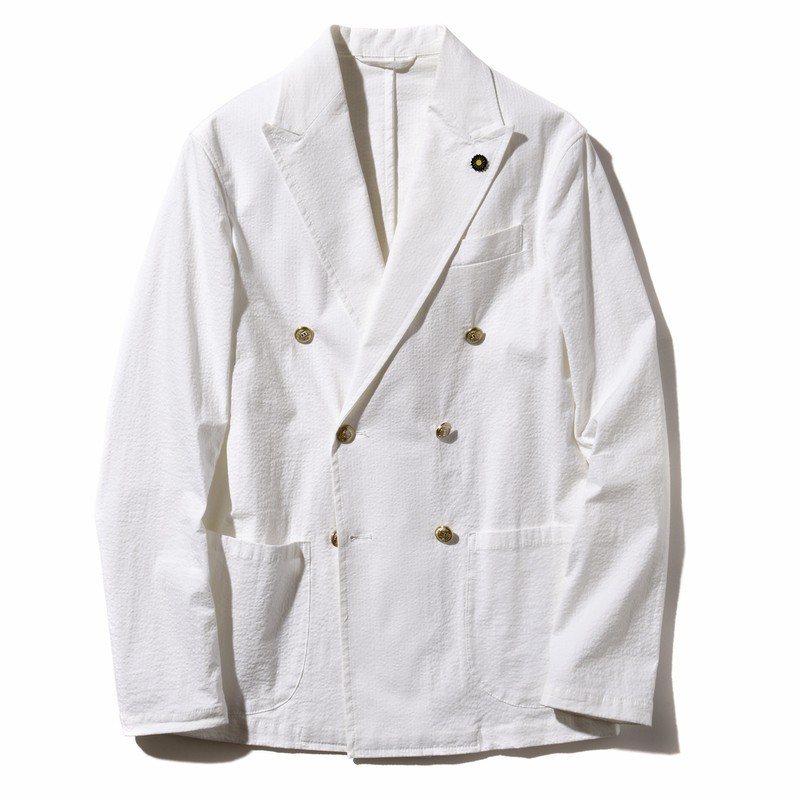 コットンにストレッチ素材をブレンドした軽やかなシアサッカー生地に、南イタリアのカミチェリアらしさが漂うダブルのブレザー。身頃だけでなく袖の裏地も配したアンコン仕立ても相まって、まさしくシャツ並みの着心地です。真っ白な中、ゴールドカラーのメタルボタンが映えます。