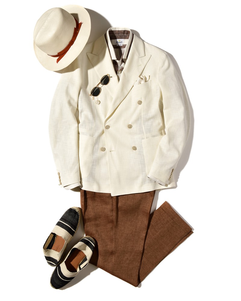 モロッカンな雰囲気漂うカラーリング。リネンのストライプシャツとジュートソールのシューズ、そしてジャケットとオフ白で揃えたハットが、軽やかにして上品さを漂わせます。ジャケットは、ウールにコットンとナイロンをブレンドしたシャツ生地仕立て。ホップサック調の表情ある生地が、気取りのないナチュラルな雰囲気を演出します。