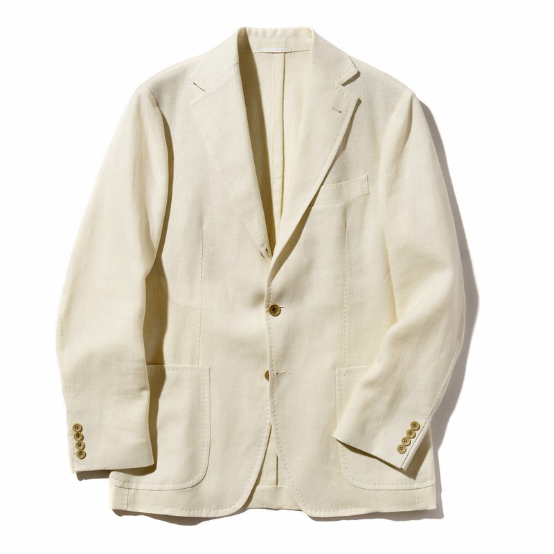 ウールに対して50%ブレンドしたリネンとホップサック調の織りが、ドライで涼やかな雰囲気を演出。副資材も極力省いたアンコン仕立てではありますが、やや高めのゴージラインやバルカポケットなど、クラシックかつ見栄えのする作りによって、着姿には品格が漂います。