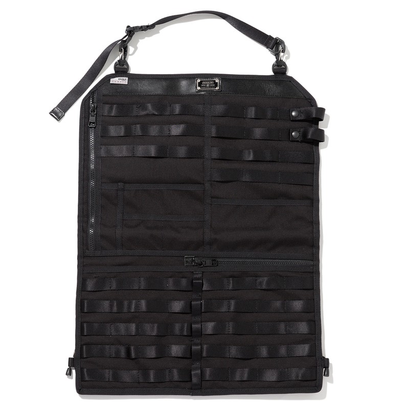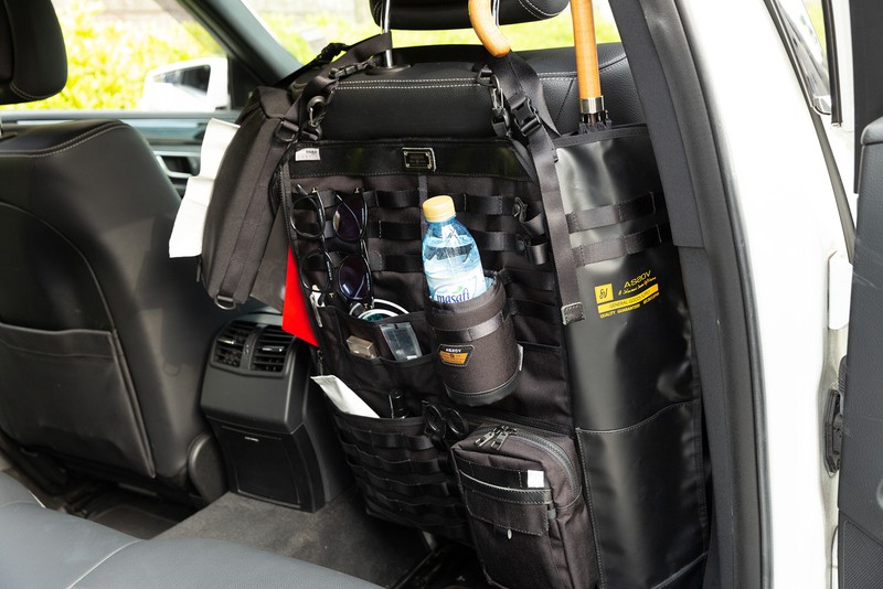 コレ、いわゆるウォールポケットでして、最大の特徴はミリタリーバッグのモールシステムのような要領で拡張できる点。傘入れやティッシュボックス、ドリンクホルダーなど、使い勝手を高めてくれる全8種類のアイテムが展開されています。しかも、素材には66ナイロン糸を使ったアッソブオリジナルのバリスティックナイロン製というこだわり様。艶感のあるレザーパーツもあしらわれ、高級セダンに取り付けても遜色ない仕上がりですよ。