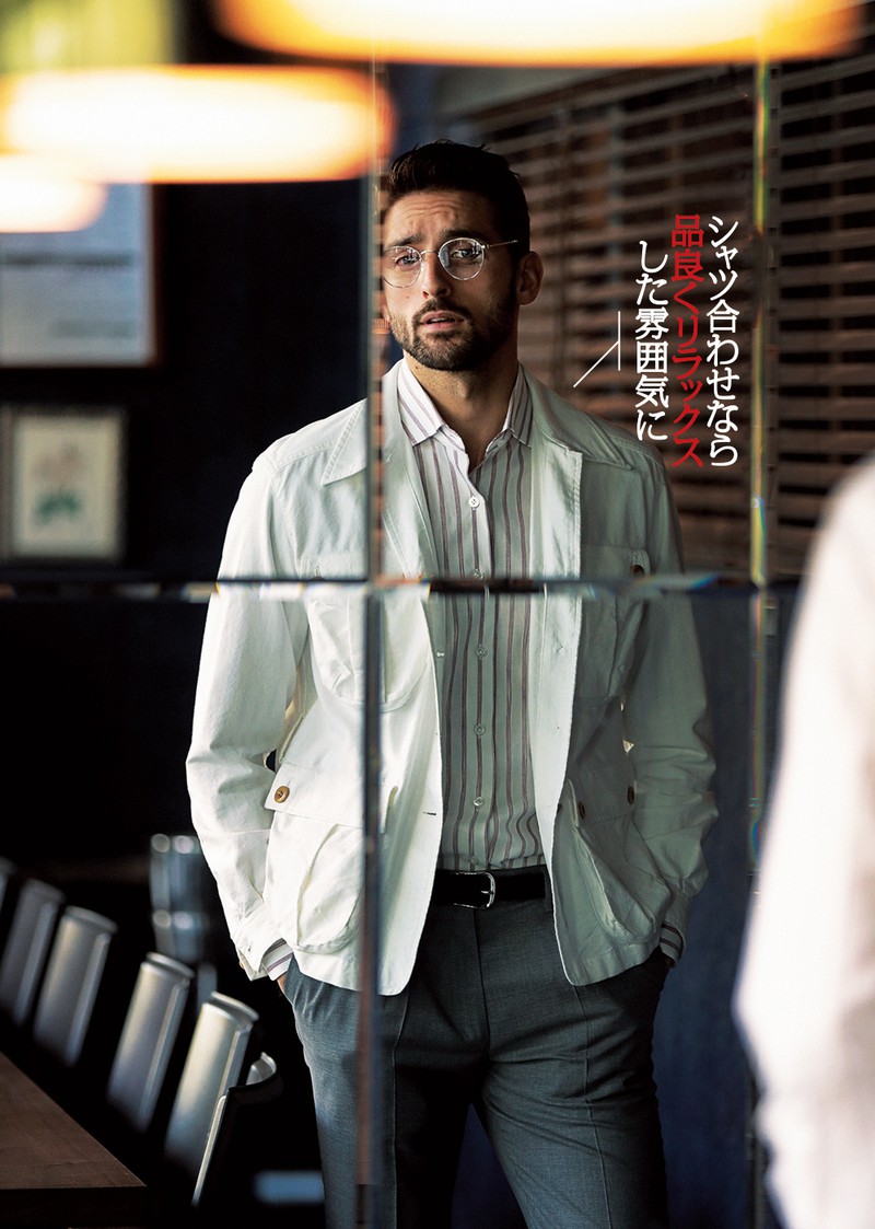 ▲ Tシャツの上にサラリと羽織れば、タフな男らしさが引き立ちます。ジャケット6万円/ポール・スミス コレクション(ポール・スミス リミテッド)、Tシャツ7000円/ブリッラ ペル イル グスト、靴7万9000円/クロケット&ジョーンズ(ともにビームス 六本木ヒルズ)、パンツ3万2000円/ベルウィッチ(アマン)、スカーフ1万2000円/パオロ アルビザッティ(ナノ・ユニバース カスタマーサービス)、サングラス4万7000円/アイヴァン 7285(アイヴァン 7285 トウキョウ)