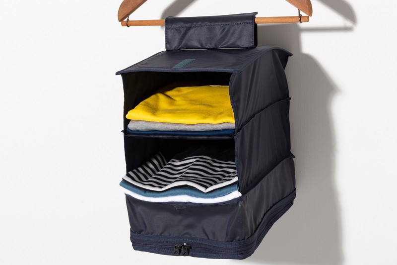 ニットホルダーは2段あり、最大4枚のニットを収納可能。パッキング時はニットホルダーごとベルクロで留めるため、しっかりと固定出来る仕組みです。自宅で常用するならもう数枚のニットやTシャツも収められます。