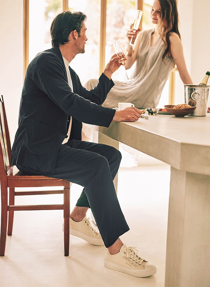 そんな時にオフ白スニーカーなら、ゆったりムードのまんまメロウなハズしを効かせられるんですね。なお、こうした合わせを想定し、ボリューミーすぎないシュッとしたフォルムを選んでおけば、セットアップとの相性も高まりますよ。