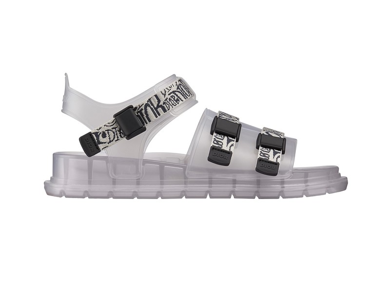 どうです、これからの季節にうってつけの透け透け感。こちら「アクア ディオール」ラインの最新作です。クリアのラバー素材をチョイスした斬新な提案はさすがディオールです。さらに、調節可能なナイロンバンドにもご注目ください。こちら、波のウェーブモチーフ“DIOR”ロゴをジャカード織りであしらっておりまして、高級感と季節感もちゃっかり漂うデザインに仕上がっております。