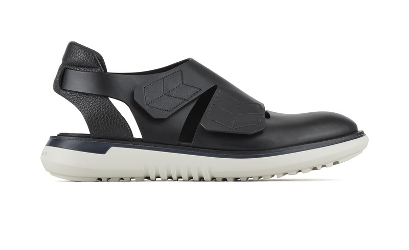 サンダルなのにダブルモンク風という、目を引くデザインは、ジョルジオ・アルマーニ大先生の面目躍如。そしてアッパーは面ファスナー仕様になっておりまして、脱ぎ履きが簡単というスグレモノなんです。もうひとつのポイントはかかとですよ、か・か・と。くるぶし周りで、スニーカーのようにしっかり足首をホールドしてくれますから、かかとの靴擦れや、あのスポスポ抜ける不快感ともオサラバできますよ。