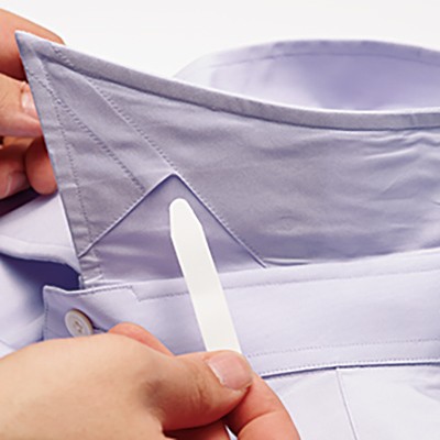 白じゃないシャツ×ペラリな艶タイで作るVゾーンは、その華やかさに加え、柔らかな雰囲気が大きな魅力。なので、シャツのカラーステイは最初から抜いて、襟元にも柔らか〜なニュアンスを漂わせましょう。