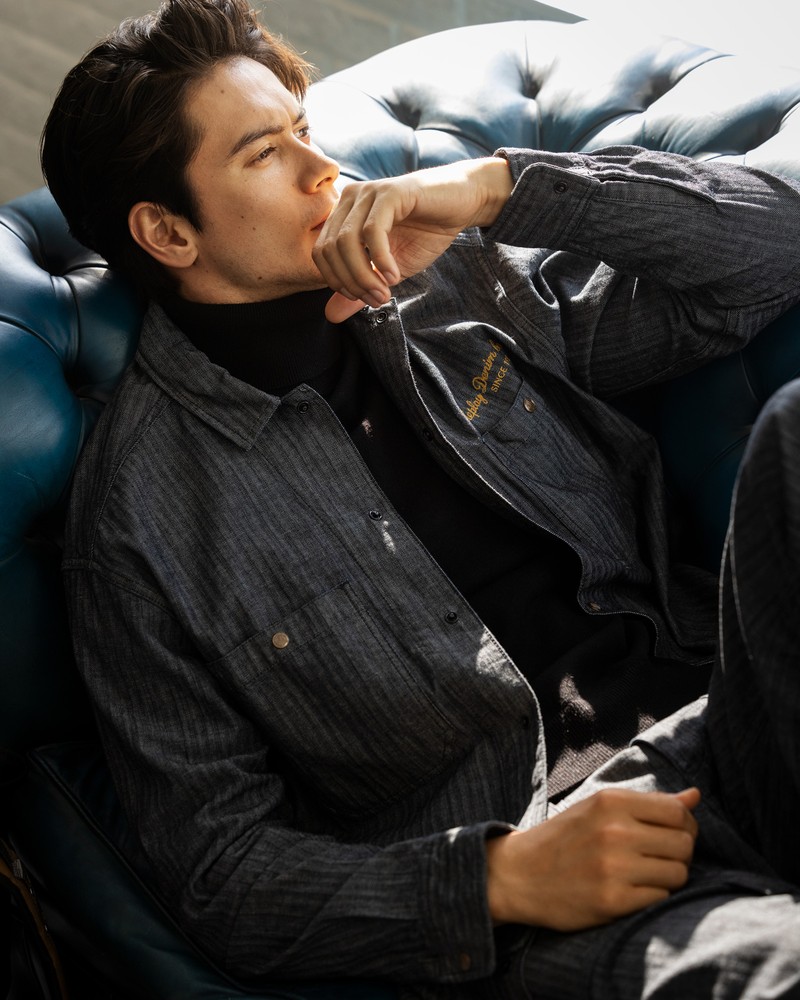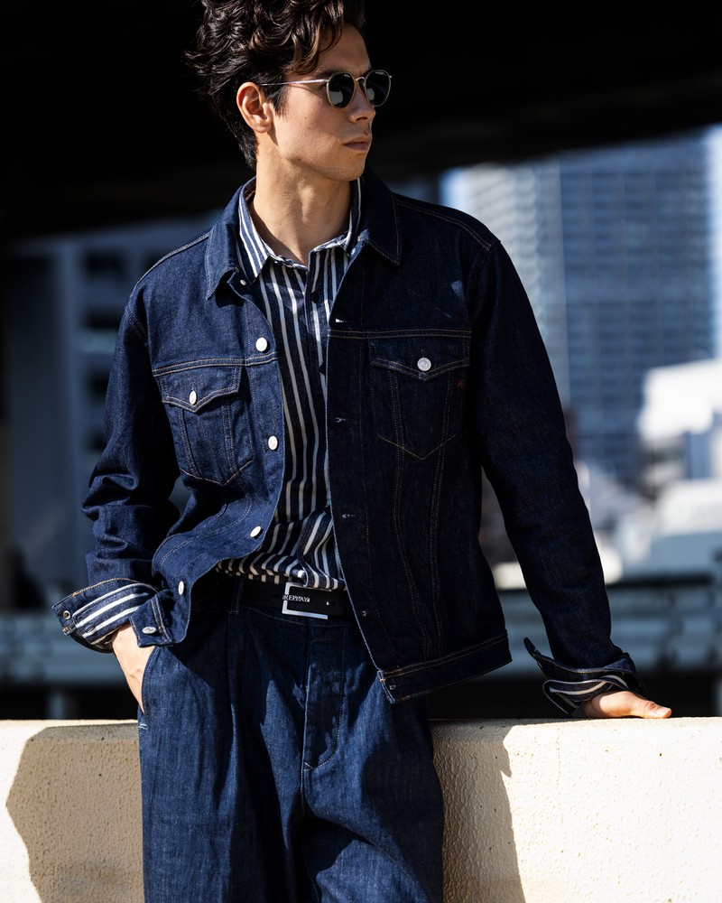 ▲ 12オンスデニムを採用したチノタイプのパンツとは、インディゴ同士とあってセットアップとして着られます。パンツはテーパードシルエットで、プリーツやスラントポケットと相まって都会的なデニムセットアップに。