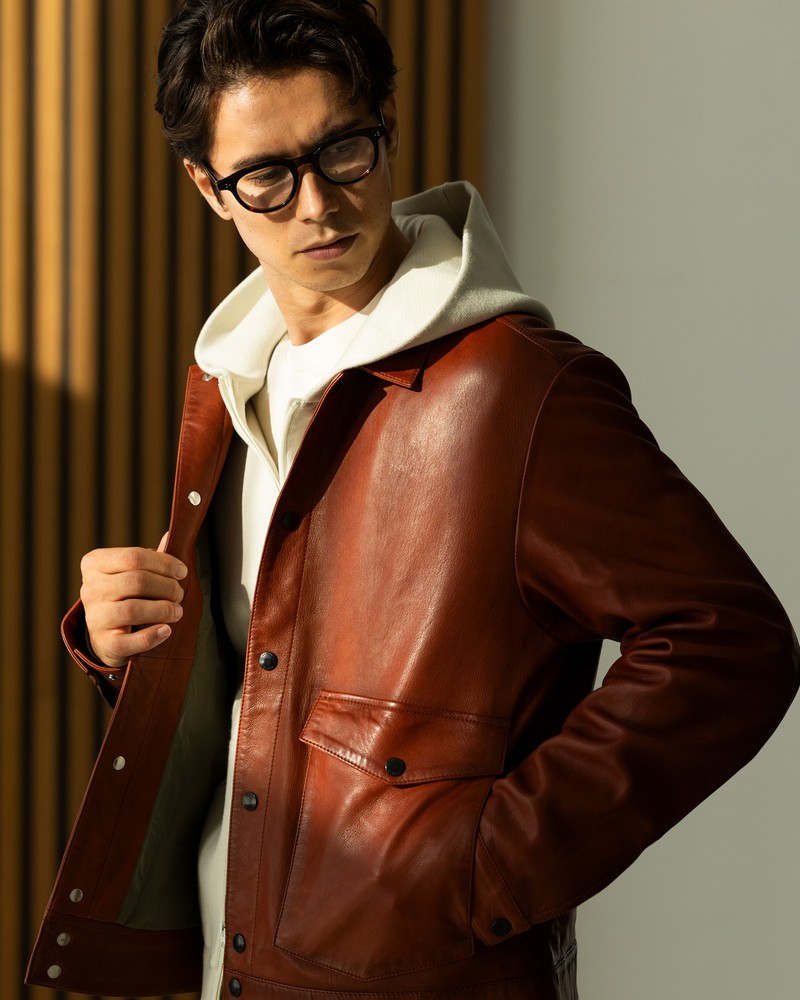 ▲ ややムラ感のあるブラウンが、ヴィンテージな雰囲気を演出。しっとりと柔らかなシープが、無骨なフライトジャケットデザインにリッチな印象を与えてくれます。だから、ニットフーディとも好相性。