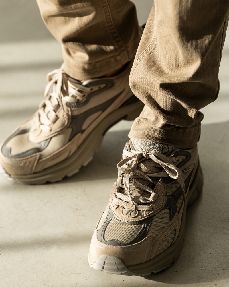 ▲ 細身のパンツにもワイドパンツにもバランスが良い厚底を採用する、リフランナーOP4スニーカー。ベージュにグレーをあしらったいわゆるグレージュカラーは、コーデを選ばない万能色です。