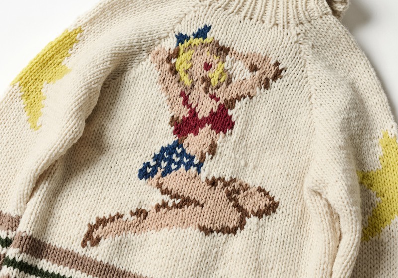 どちらかといえば秋冬のモチーフが多いカウチンだけに、こんなパームツリーやピンナップガールの採用は新鮮。南米ペルー産のウールを旧式の紡績機械で紡いだ糸による、空気をたっぷりと含んだ膨らみ感も見どころ。オヤジの茶目っ気演出には、もってこいのカウチンです。