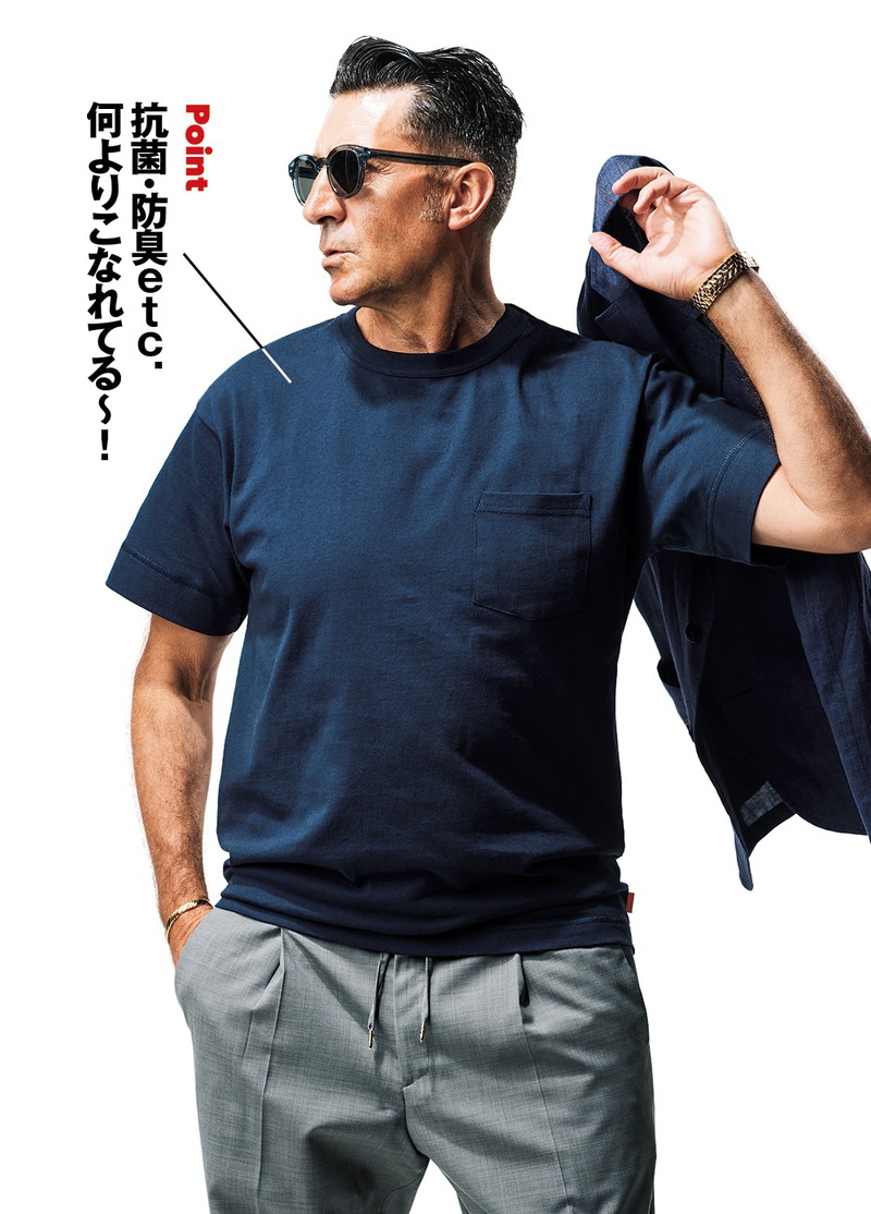 ▲ 便利なポケT、ネックは伸びにくいバインダーネック仕様となっています。 Tシャツ3500円/ヘルスニット(ヘルスニット・ブランズ)、ジャケット5万2000円/ジャンネット、パンツ2万5000円/ブリリア 1949(ともにトヨダトレーディング プレスルーム)、サングラス3万4300円/ オリバーピープルズ(オリバーピープルズ東京ギャラリー)、時計555万円/フランク ミュラー(フランク ミュラー ウォッチランド東京)、バングル63万円/シンパシー・オブ・ソウル(S.O.S fp 恵比寿本店)