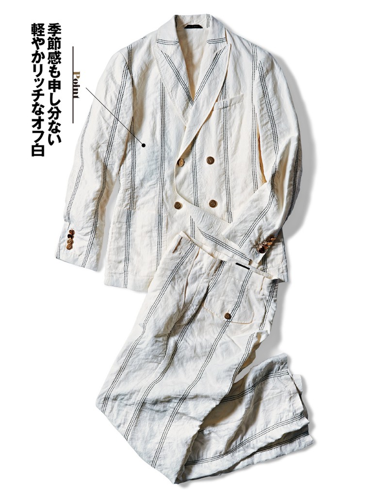 男を最高に引き立たせるスーツスタイルも、蒸し暑い季節はどうしても敬遠されがち。ですが、リネン混のスーツなら軽やかで涼しいうえ、イイ塩梅のシワがこなれ感まで醸してくれて、アナタのセンスを格上げしてくれること請け合いです!