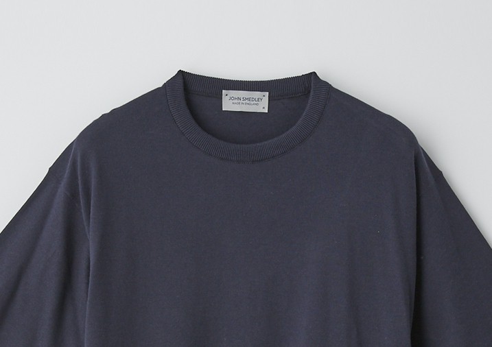早くも品薄となっているそのニットTは、おなじみの上質なシーアイランドコットンで仕上げたハイゲージタイプなのですが、クルーネックが少しだけ進化しました。