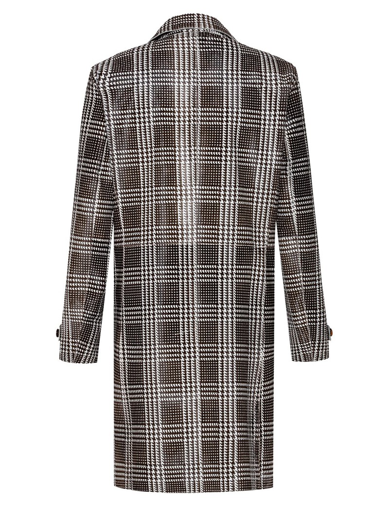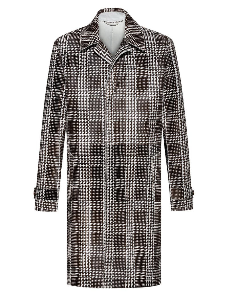 なんとボスでは今季、迫力満点のレザー製ロングコートを打ち出し、早くも話題となっているのです。しかも起毛したショートヘアレザーで目を引く大柄チェックパターンというから、街で会ったら二度見も確実。とはいえ写真のとおり、形はクラシックなバルカラー型かつ、柄行きは正統派の英国調グレンチェック。それゆえに手持ちのニット&ウールパンツといったトラッドかつ上品な装いにも合わせやすいところがミソなんです。