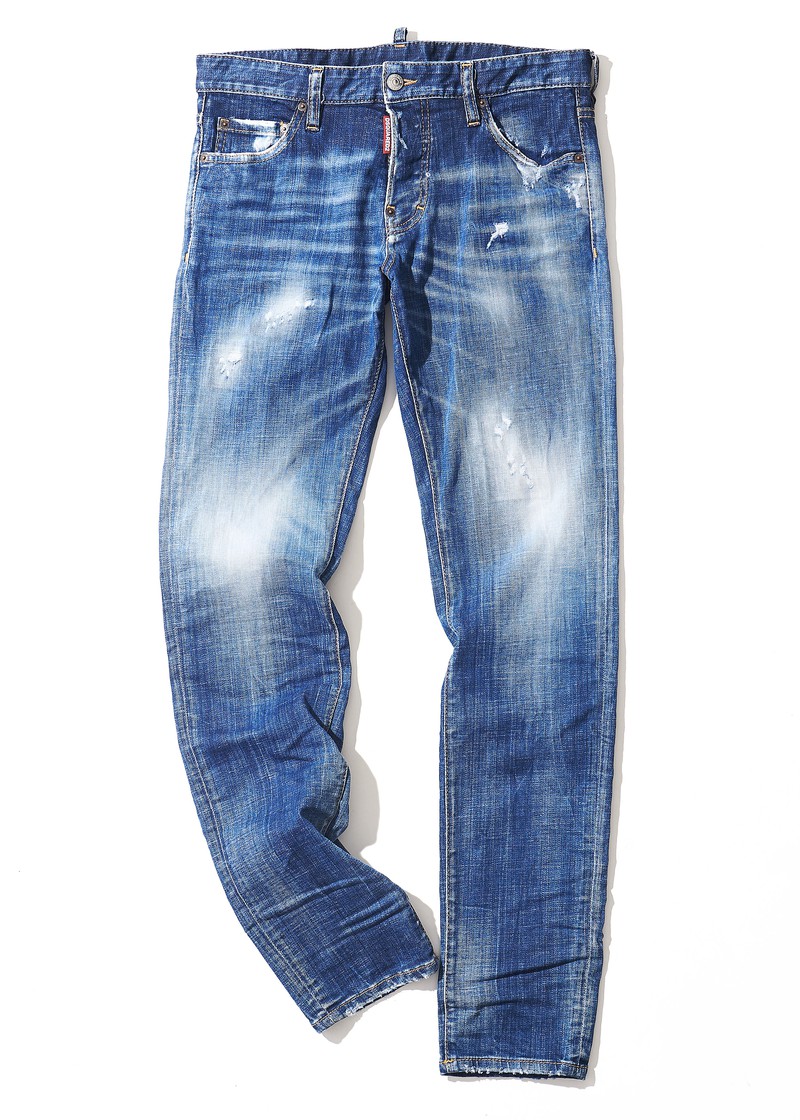 デニムの加工に定評のあるディースクエアード。今回はラギッドな雰囲気と、今の気分を反映したシルエットが魅力の一本をご紹介します。写真はスリムと呼ばれる、股上浅めのストレートシルエットを採用。欧州じゃ、このシルエットが断トツのロングセラーなのだとか。ポケット口、ヒザ周りの圧倒的なユーズド感はさすがですね。さらに背面には色抜きで、ブランド名が書かれるなど、遊び心も添えられていますよ。