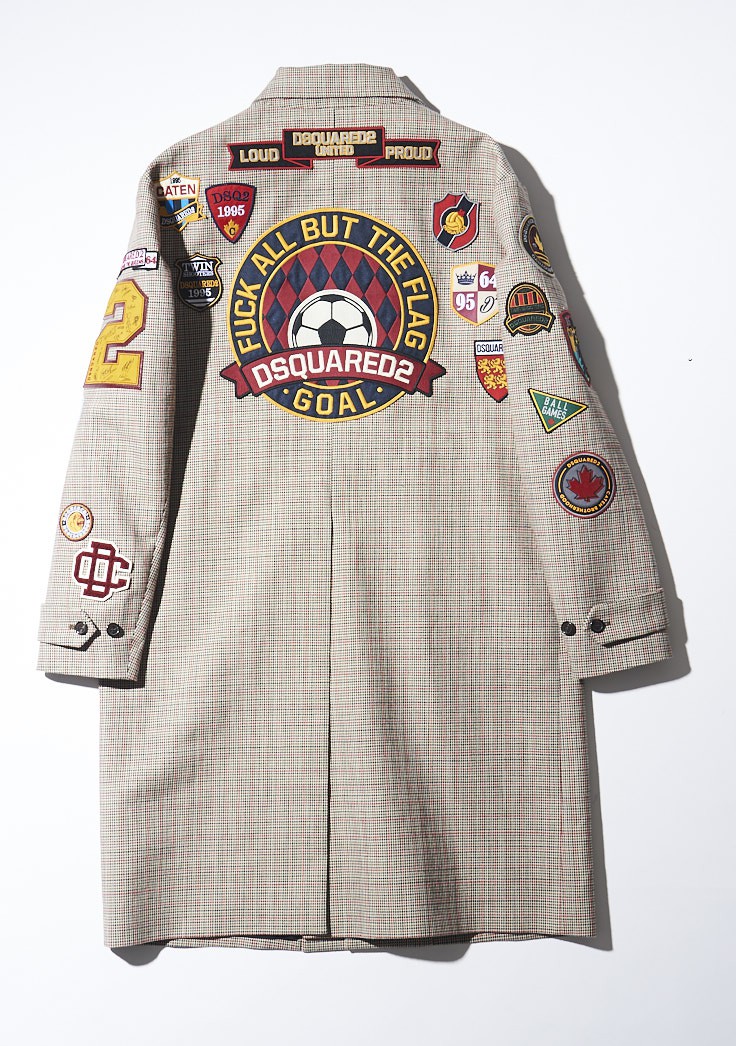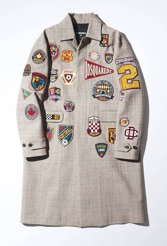 架空のクラブ・チームのワッペンを、カスタム風に貼り付けたステンカラーコート。シルエットは結構ボディが大きく、バックも余裕あるシルエットなので、クラシックなコートとは一線を画す今っぽいフォルムを描いています。