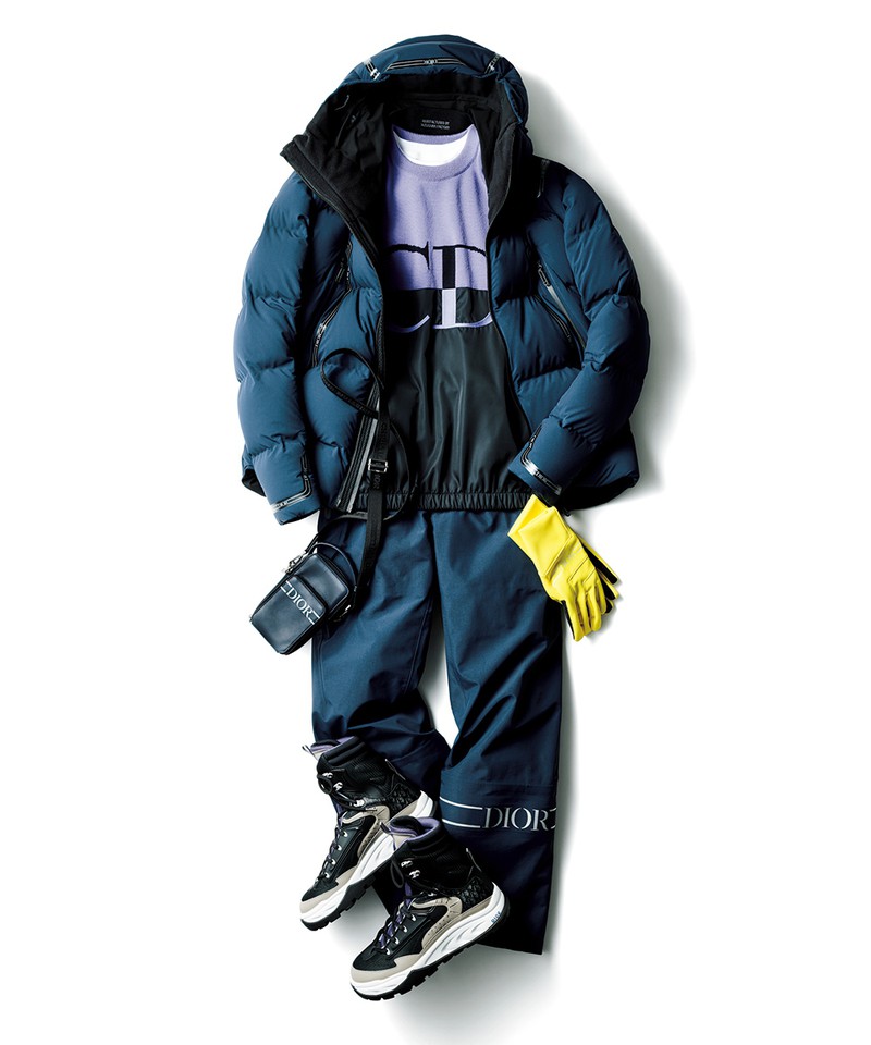ブランドのメンズ アーティスティックディレクターのキム・ジョーンズがインスピレーションの源としたのがヴィンテージな日本のウインタースポーツスタイル。すべてに“DIOR”ロゴがあしらわれた逸品でつくるモテる最旬雪山着です。ダウン60万円、ニット20万円、パンツ33万円、グローブ4万7000円、バッグ14万5000円、ブーツ17万5000円/すべてディオール(クリスチャン ディオール)