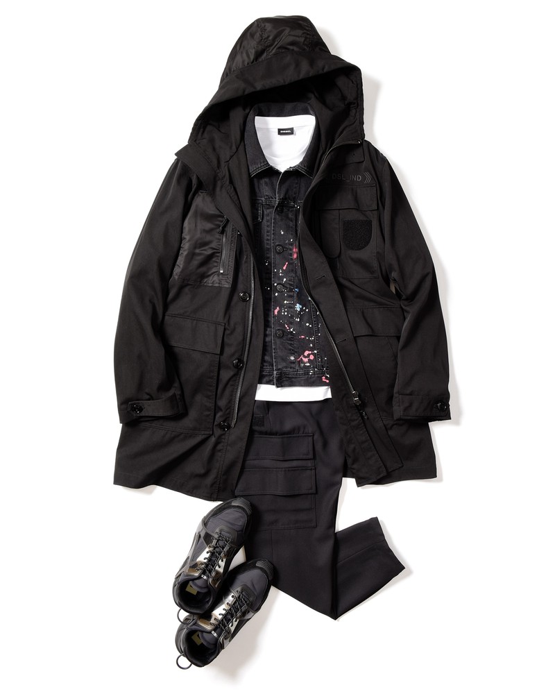 そこで提案するのが、ディーゼルの真っ黒コーディネート。ロックスターのワードローブをイメージした今シーズンは、黒がキーカラーになっており、大人の黒スタイルに役立つアイテムが揃います。素材感やディテールにこだわった黒アイテムと、ただ黒いアイテムを合わせただけじゃない差別化のできる真っ黒スタイルをご覧あれ。