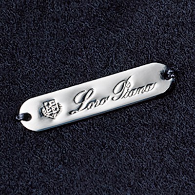 非常に軽いフワッフワッな触り心地も◎。手作業で縫い付けたホワイト・ゴールドのタグの片面はロロ・ピアーナのロゴ、もう片面にはシリアルナンバーが施されますよ。[175×43㎝] *7㎝のフリンジ付き