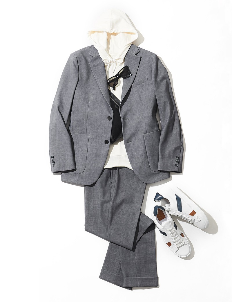 プリントにより上質な生地感を演出している点はビジネスに有効ですが、一方でパッチポケットなのでカジュアルな雰囲気も両立。だから、スウェットパーカにスニーカーを合わせた大人の休日スタイルも楽しめてしまうんです。